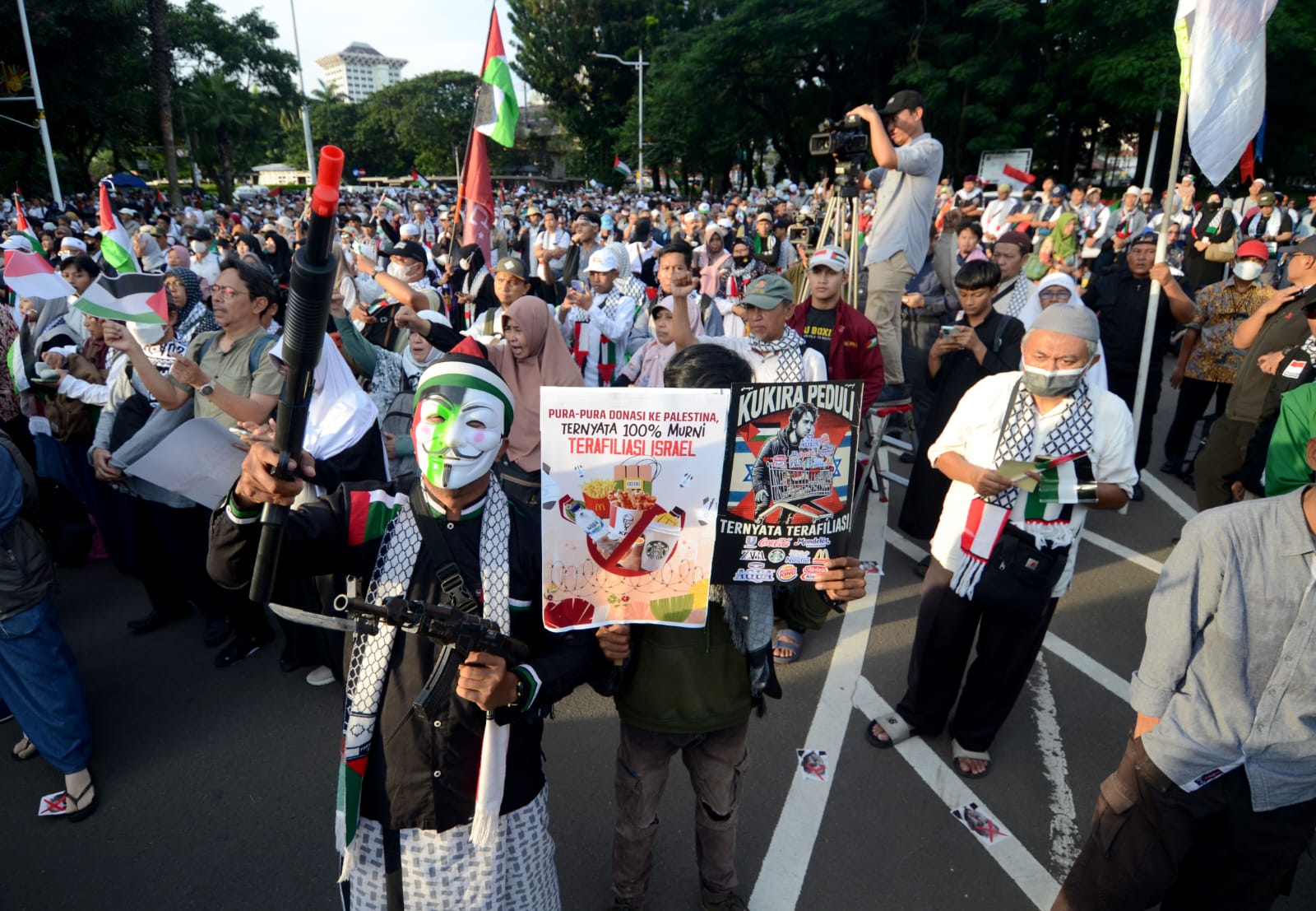 Selain itu, massa aksi juga menyerukan melalui poster untuk terus melalukan boikot terhadap produk yang terafiliasi dengan Israel sesuai fatwa MUI.