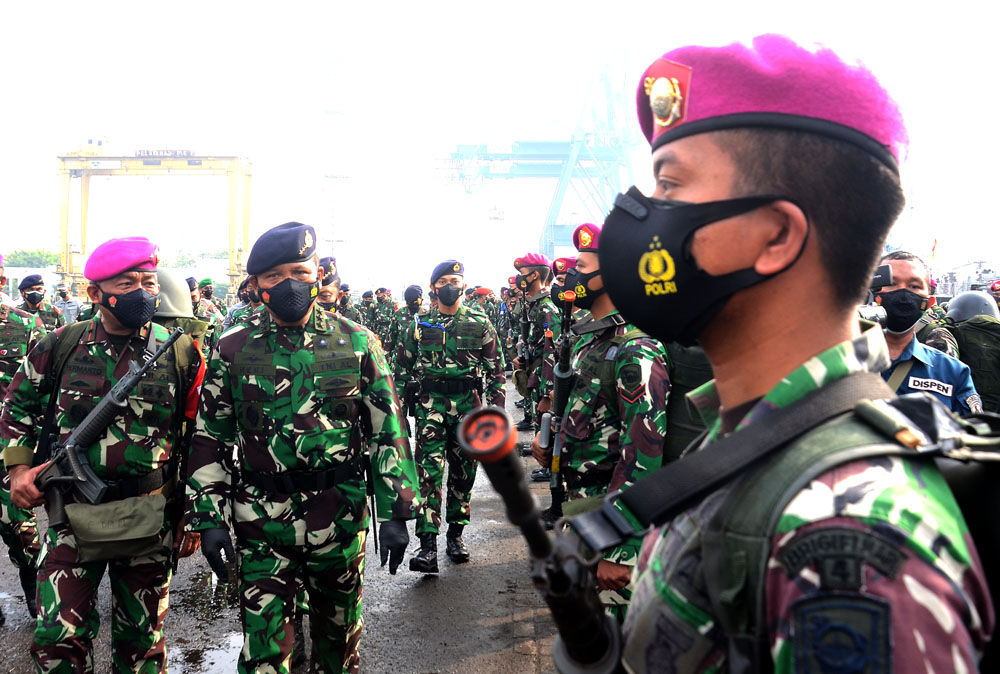 Wakil Kepala Staf Angkatan Laut (Wakasal) Laksamana Madya TNI Ahmadi Heri Purwono (kiri) mengecek senjata prajurit saat Apel Gelar Kesiapan Latihan Puncak TNI AL Armada Jaya XXXIX TA 2021 di JICT II, Tanjung Priok, Jakarta, Senin (28/6/2021). Prajurit TNI AL dikerahkan untuk membantu penanganan serta mempercepat program vaksinasi dikarenakan tingginya tingkat penularan kasus COVID-19 di Indonesia, maka pelaksanaan Latihan Armada Jaya XXXIX TA.2021 yang semula akan berlangsung pada 28 Juni hingga 7 Juli 2021 di Dabo Singkep, Kepulauan Riau ditunda.