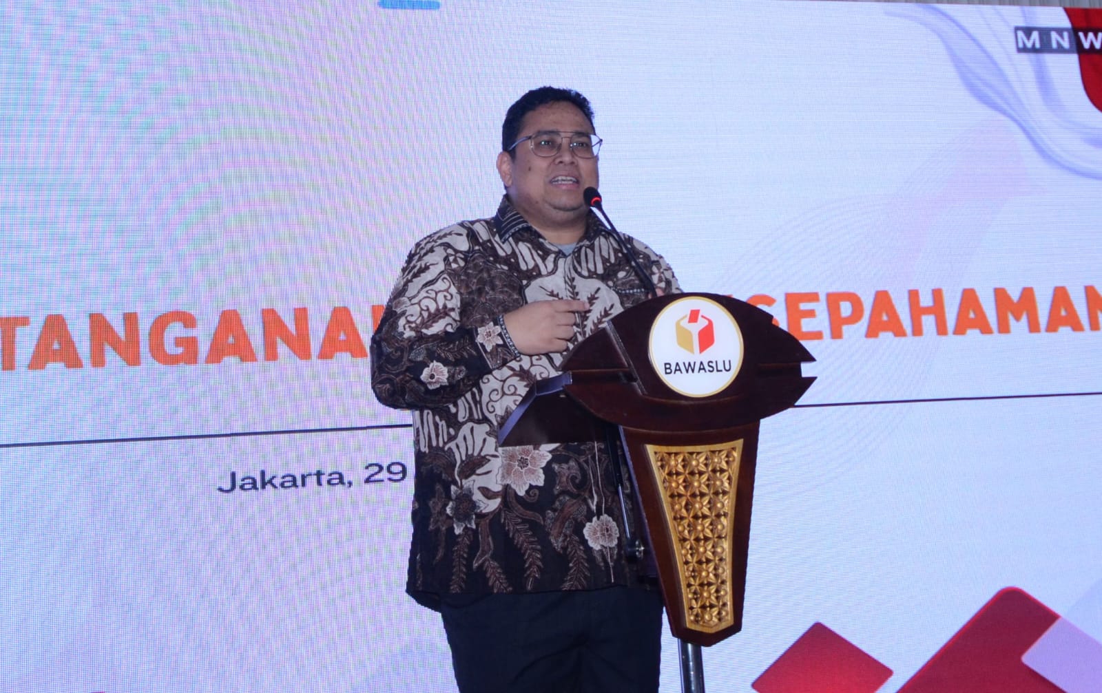 Ketua Badan Pengawas Pemilihan Umum RI Rahmat Bagja memberikan sambutan setelah menandatangani Nota Kesepahaman dengan Jaringan Pendidikan Pemilih untuk Rakyat (JPPR), Kalyanamitra, Cek Fakta, dan Koalisi Perempuan Indonesia di Kantor Bawaslu, Jakarta, Selasa (25/10/2024).