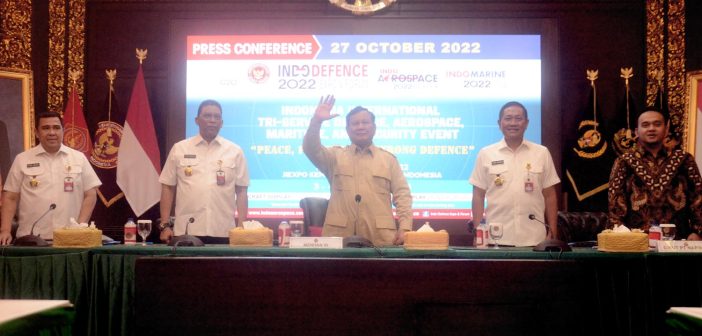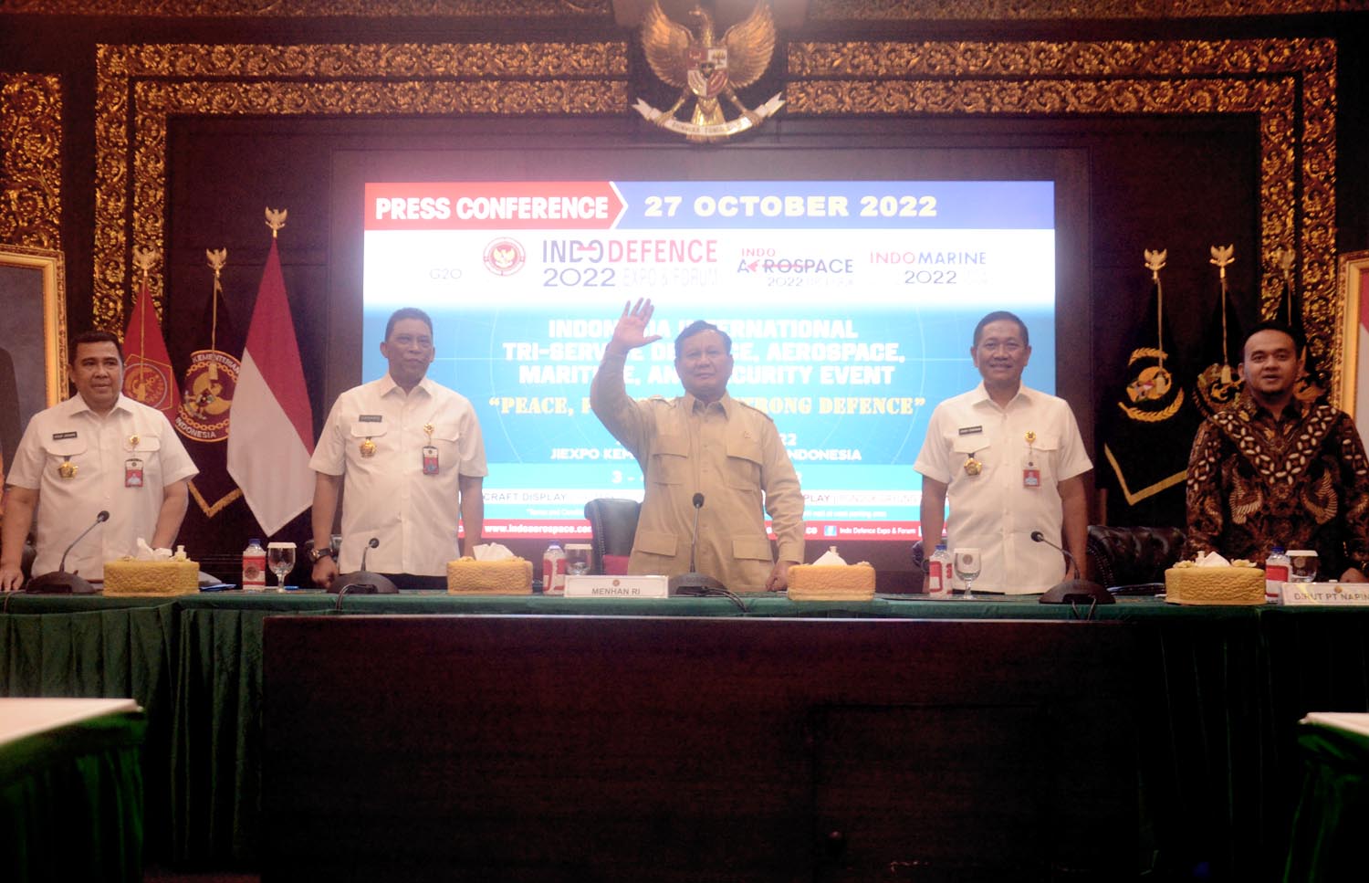 Kabaranahan Kemhan Marsda TNI Yusuf Jauhari bersama Direktorat Jenderal Potensi Pertahanan Kementerian Pertahanan Republik Indonesia Mayjen TNI Dadang Hendrayudha, Menteri Pertahanan RI Prabowo Subianto, Sekretaris Jenderal Kementerian Pertahanan (Sekjen Kemhan) Republik Indonesia(RI) Marsekal Madya TNI Donny Ermawan Taufanto dan Managing Director PT Napindo Media Ashatama Arya Seta Wiriadipura saat Konferensi Pers Indo Defence 2022 Expo & Forum di Kantor Kementerian Pertahanan, Jakarta Pusat, Kamis (27/10/2022). Kementerian Pertahanan (Kemhan) akan menyelenggarakan pameran Alutsista (Alat Utama Sistem Senjata Tentara Nasional Indonesia) dari tanggal 2 November hingga 5 November 2022.