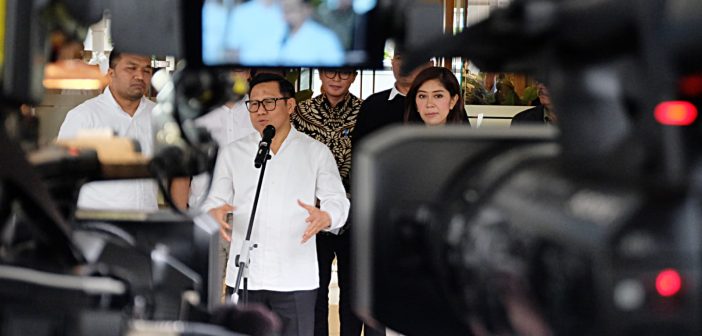Menko PM Muhaimin Iskandar bersama Menkomdigi Meutya Hafid saat konferensi pers penanganan judi online yang berlangsung di kantor Kemenko PMK, Jakarta, Kamis (28/11/2024).