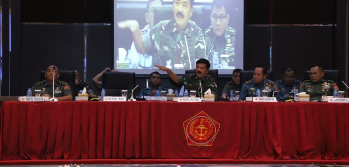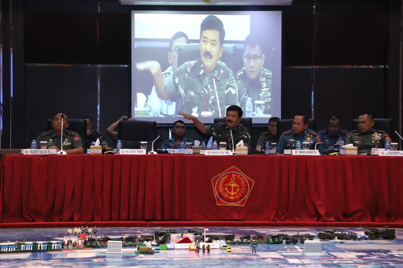 Jakarta, Teritorial.com – Panglima TNI Marsekal TNI Hadi Tjahjanto, S.I.P. didampingi antara lain Irjen TNI Letjen TNI M. Herindra, M.A., M.Sc., Danjen Akademi TNI Laksdya TNI Aan Kurnia, S.Sos., Pangdam Jaya Mayjen TNI Eko Margiyono, para Asisten Panglima TNI dan Mabes Angkatan serta Kapuspen TNI Mayjen TNI Sisriadi, memimpin pelaksanaan Tactical Floor Game (TFG) kesiapan HUT ke-74 TNI Tahun 2019, bertempat di Aula Gatot Soebroto, Mabes TNI, Cilangkap, Jakarta Timur, Senin (9/9/2019). Upacara Parade dan Defile HUT ke-74 TNI tanggal 5 Oktober 2019, akan dilaksanakan di Lanud Halim Perdanakusuma, Jakarta Timur.