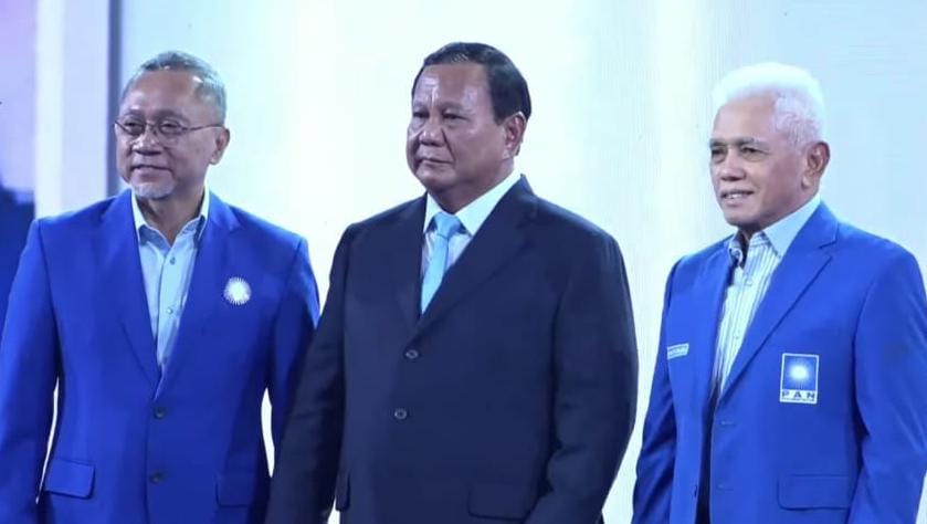 Presiden terpilih Prabowo Subianto (tengah) bersama Ketua Umum Partai Amanat Nasional (PAN) Zulkifli Hasan (kedua kanan) dan Ketua Majelis Penasihat Partai Hatta Rajasa (kedua kiri) saat menghadiri penutupan Kongres ke-VI PAN di Jakarta, Sabtu (24/8/2024). Kongres ke-VI PAN secara aklamasi menetapkan incumbent Zulkifli Hasan sebagai Ketua Umum PAN periode 2024-2029.