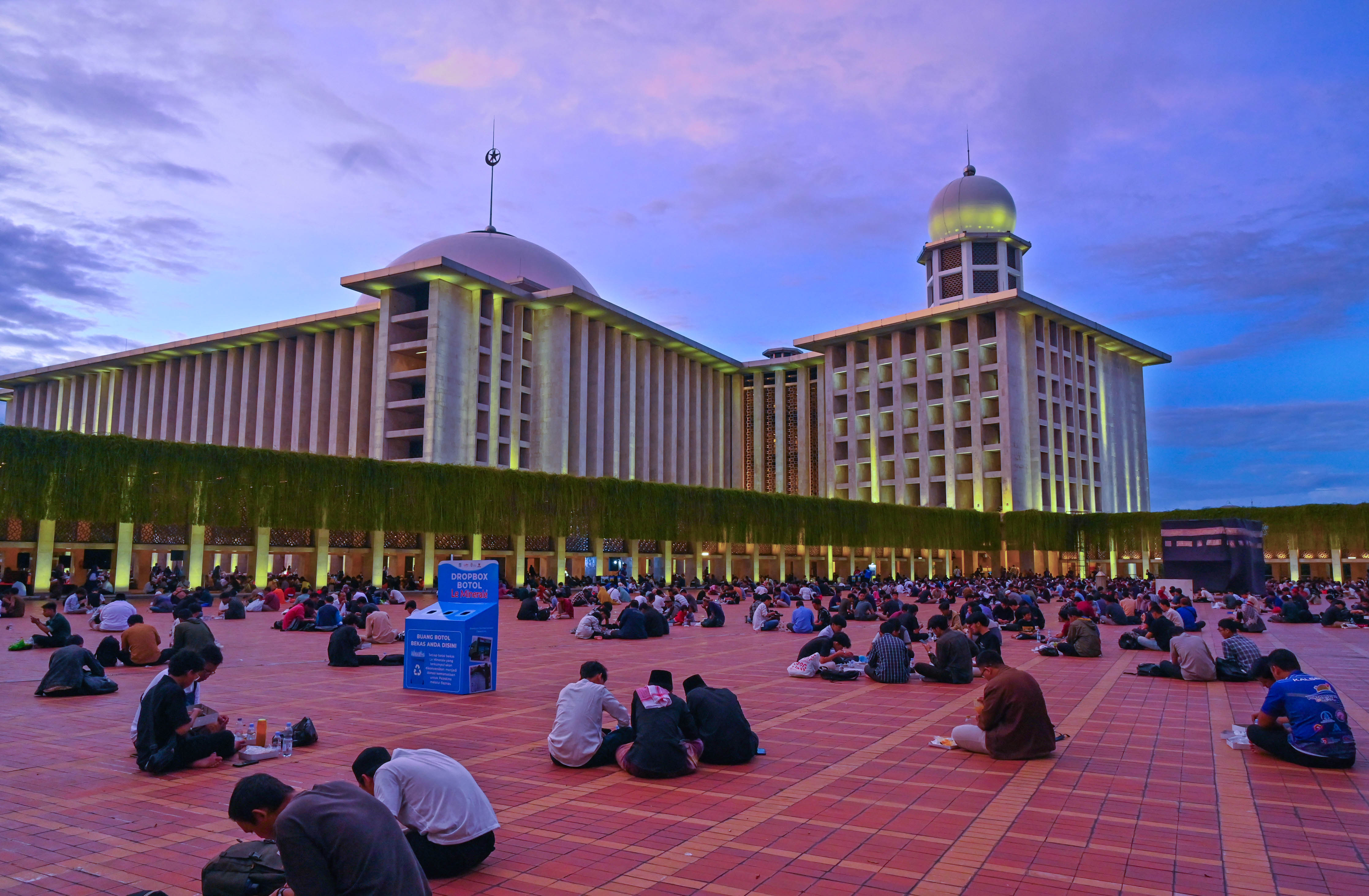 Jamaah sedang melaksanakan buka puasa di selasar Masjid Istiqlal, Jakarta, Jumat (14/3/2025). Pihak Masjid Istiqlal bekerjasama dengan Le Minerale membagikan 3.000-5.000 botol Le Minerale dan total sebanyak 8.000 makanan untuk umat muslim yang berbuka puasa. Foto: Tahta Aidilla