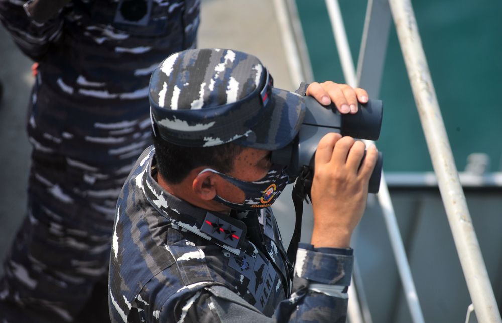 Panglima Koarmada I Laksamana Muda TNI Ahmadi Heri Purwono (kanan) dan Komandan Korps Marinir Mayjen TNI (Mar) Suhartono (kiri) memeriksa kesiapan Prajurit TNI Angkatan Laut melakukan latihan pendaratan helikopter AS565 MBe Panther di KRI Semarang, Perairan Teluk Jakarta, Selasa (21/7/2020). Latihan tersebut merupakan persiapan kegiatan manuvra lapangan (Manlap) Geladi Tugas Tempur Tingkat III (L-3) Koarmada I, Latihan Pendaratan Amfibi, dan Pengangkatan Kasal Sebagai Warga Kehormatan Korps Marinir di Pantai Todak Dabo Singkep, Kepulauan Riau pada 22 – 28 Juli 2020.
