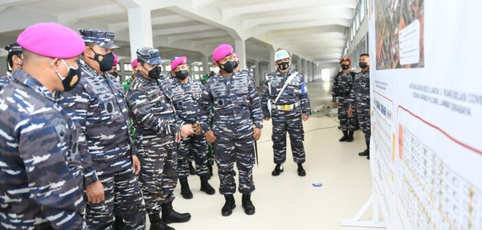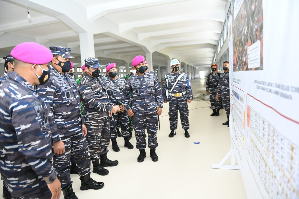 JAKARTA, Teritorial.com – Mengantisipasi lonjakan pasien Covid-19, TNI Angkatan Laut mempersiapkan Gedung Karang Pucung yang terletak di Markas Komando (Mako) Pangkalan Marinir (Lanmar) Surabaya di Jalan Opak no. 9 sebagai tempat isolasi. Hal tersebut disampaikan oleh Kepala Staf TNI Angkatan Laut Laksamana TNI Yudo Margono, S.E., M.M., saat melaksanakan pengecekan langsung pelaksanaan “Serbuan Vaksinasi Covid-19” dan sarana-prasarana isolasi bagi pasien Covid-19 di Surabaya, Kamis (22/7).