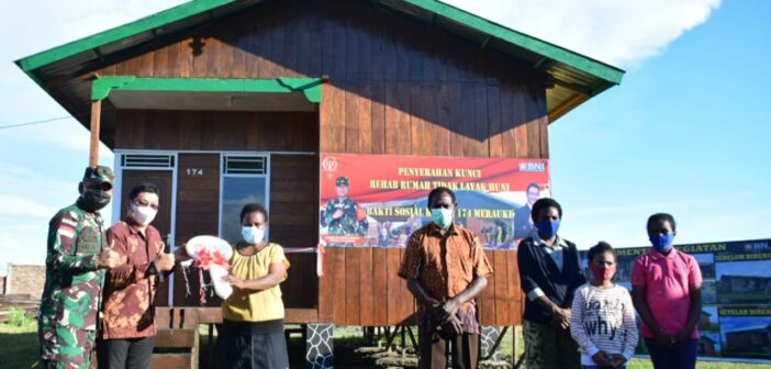 MERAUKE, Teritorial.com – Danrem 174 Merauke Brigjen TNI Bangun Nawoko menyerahkan kunci rehab Rumah Tidak Layak Huni (RTLH) kepada Beatrik Ramadi putri dari Almarhum Crisantus Gaimagaimu, salah satu tokoh veteran pejuang pembela kemerdekaan Republik Indonesia, bertempat di Jalan Perindustrian, Kelurahan Karang Indah, Distrik Merauke, Kabupaten Merauke, Papua, Selasa (20/4/2021).