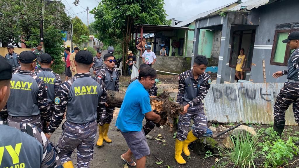 Letkol Laut (P) Tatang Yanuar Ristanto selaku Danlanudal Manado, memimpin prajurit siaga bencana, Babinsa Koramil 1310-04 Dimembe, PLN, dan Personel BPBD Minahasa Utara dalam penanganan kejadian tersebut. Tanah yang terkikis menjadi penyebab pohon tumbang, mengakibatkan kerusakan pada salah satu rumah warga.