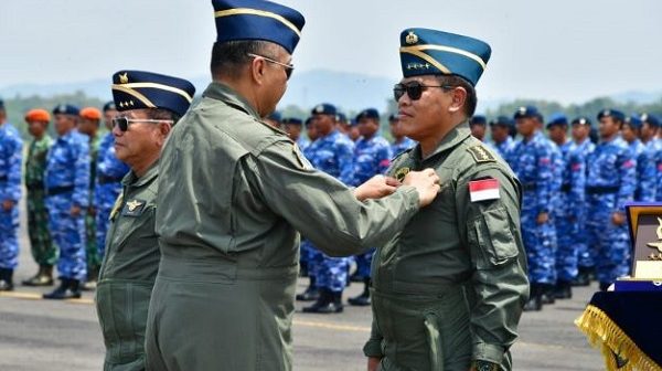 Penyematan Wing Penerbang Kehormatan Kelas I kepada KSAL oleh KSAU di Lapangan Udara (Lanud) Iswahjudi, Madiun, Jawa Timur, Selasa (21/03).