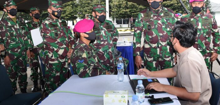 JAKARTA, Teritorial.com – “Sesuai instruksi Panglima TNI untuk memenuhi target vaksinasi Covid-19, pada bulan April 2021 harus selesai dan terpenuhi semuanya” demikian disampaikan Kepala Staf Angkatan Laut (KSAL) Laksamana TNI Yudo Margono, S.E., M.M., mewakili Panglima TNI Marsekal TNI Hadi Tjahjanto, S.IP., saat melaksanakan peninjauan serbuan vaksinasi Covid-19 yang menargetkan 3000 personel di Lapangan Hartono, Pasmar-1 Cilandak, Jakarta Selatan, Senin, (29/3).