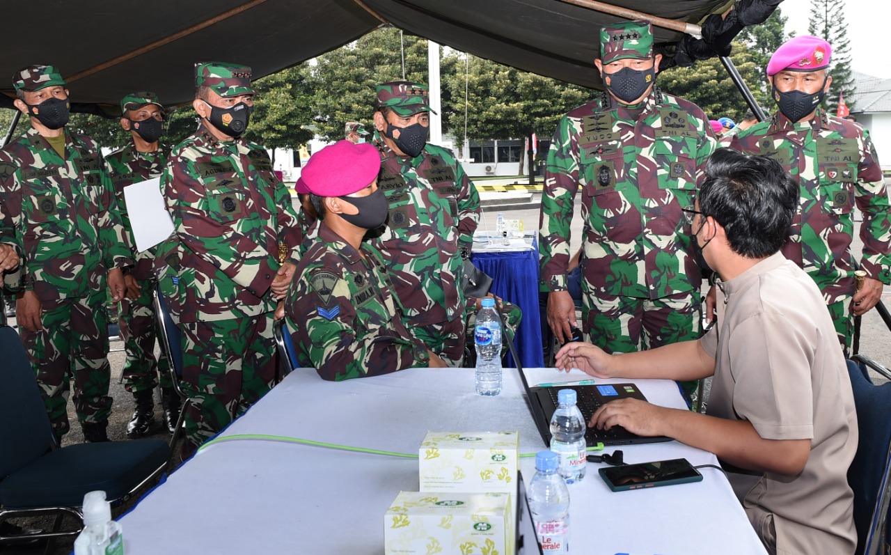 KSAL Laksamana TNI Yudo Margono didampingi Dankormar Mayjen TNI (Mar) Suhartono, M.Tr. (Han)., beserta pejabat teras TNI AL menerima penjelasan dari Kadiskes Kormar Kolonel Laut (K) dr. Ariyo S. Bintoro, Sp. U., dan Komandan Rumah Sakit TNI Angkatan Laut Marinir (Danrumkitalmar) Cilandak Kolonel Laut (K/W) dr. Jati Barandini Prastiwi, MARS., terkait pelaksanaan vaksinasi prajurit mulai dari proses registrasi, pengecekan tensi dan suhu, verifikasi, skrining, vaksinasi, observasi dan pemberian sertifikat telah divaksin.