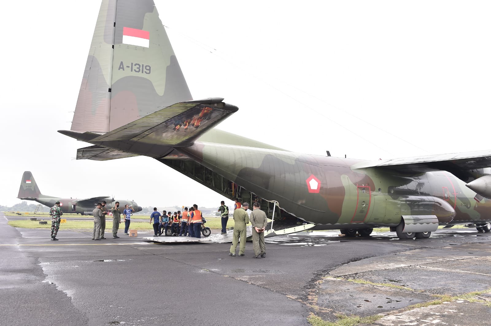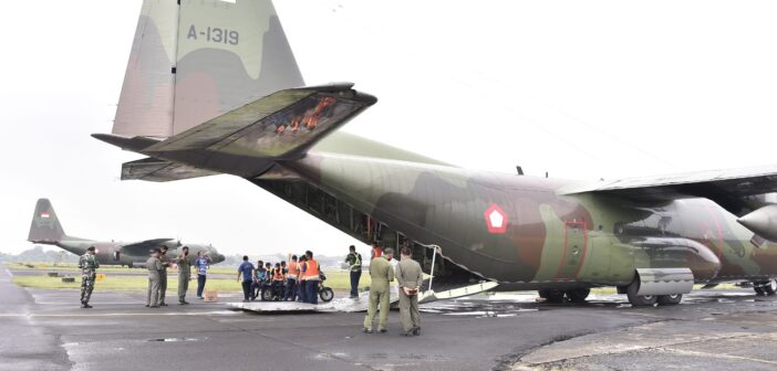 Pesawat jenis Hercules C-130 dengan Pilot Mayor Pnb Aleg Chandra dari Skadron 31 Lanud Halim Perdanakusuma mengangkut bantuan sebanyak 175 koli alat kesehatan, terdiri dari alat Oksigen Konsentrator dan Selang Nasal Cannula untuk dua wilayah di Sumatera, yaitu Padang dan Medan.