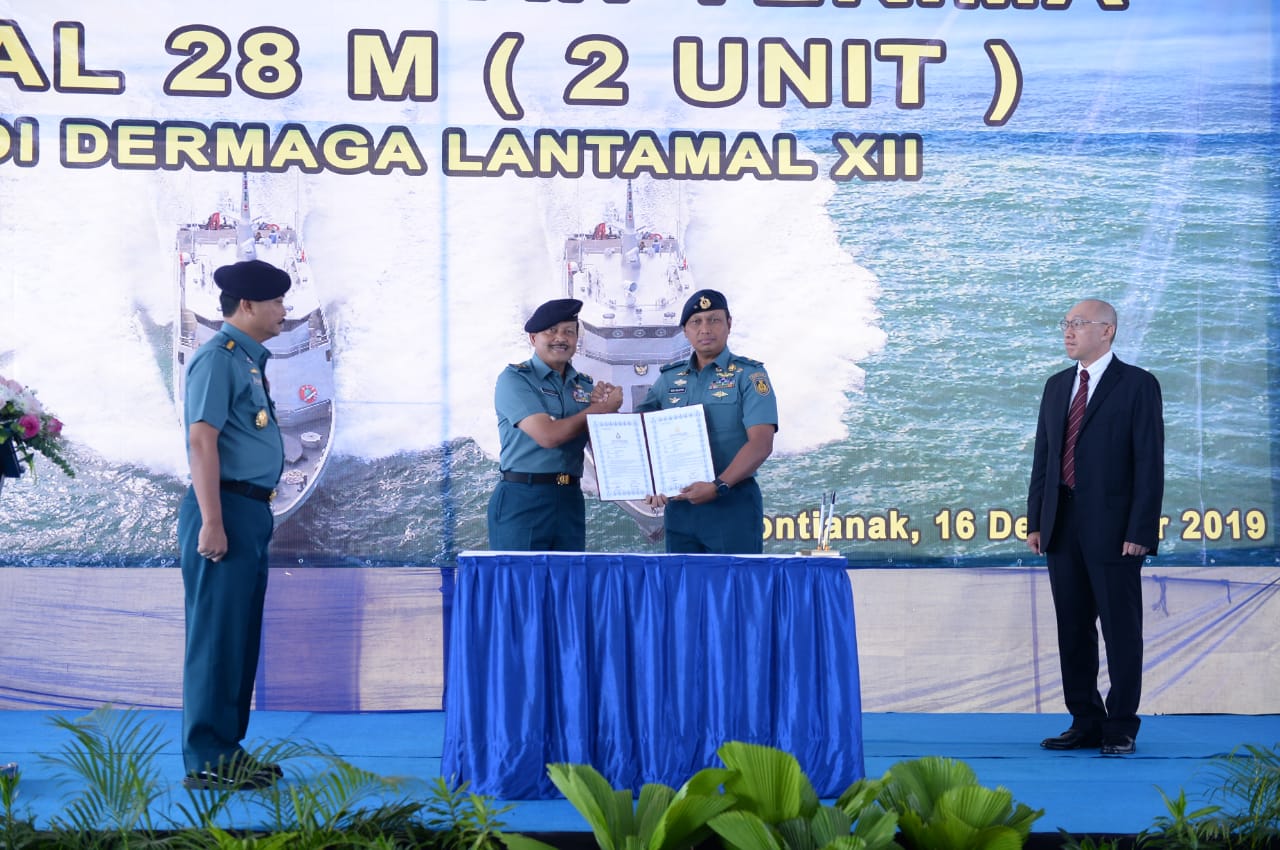 JAKARTA, Teritorial.com — Kepala Staf Angkatan Laut (Kasal) Laksamana TNI Siwi Sukma Adji, S.E., M.M., menyaksikan penandatanganan berita acara serah terima dua unit Kapal Angkatan Laut (KAL) 28 M. Kedua kapal tersebut diserahkan dari Direktur PT Steadfast Marine Tbk, Rudi Logam kepada Kepala Dinas Material Angkatan Laut (Kadismatal) Laksamana Pertama TNI Budi Sulistyo, yang selanjutnya diserahkan kepada Asisten Logistik (Aslog) Kasal Laksamana Muda TNI Moelyanto, M.Si (Han)., di Dermaga Jeruju, Lantamal XII Pontianak, Kalimantan Barat. Senin (16/12). Kehadiran kedua kapal tersebut semakin memperkuat jajaran TNI AL khususnya untuk patroli perairan pedalaman dan pelabuhan.