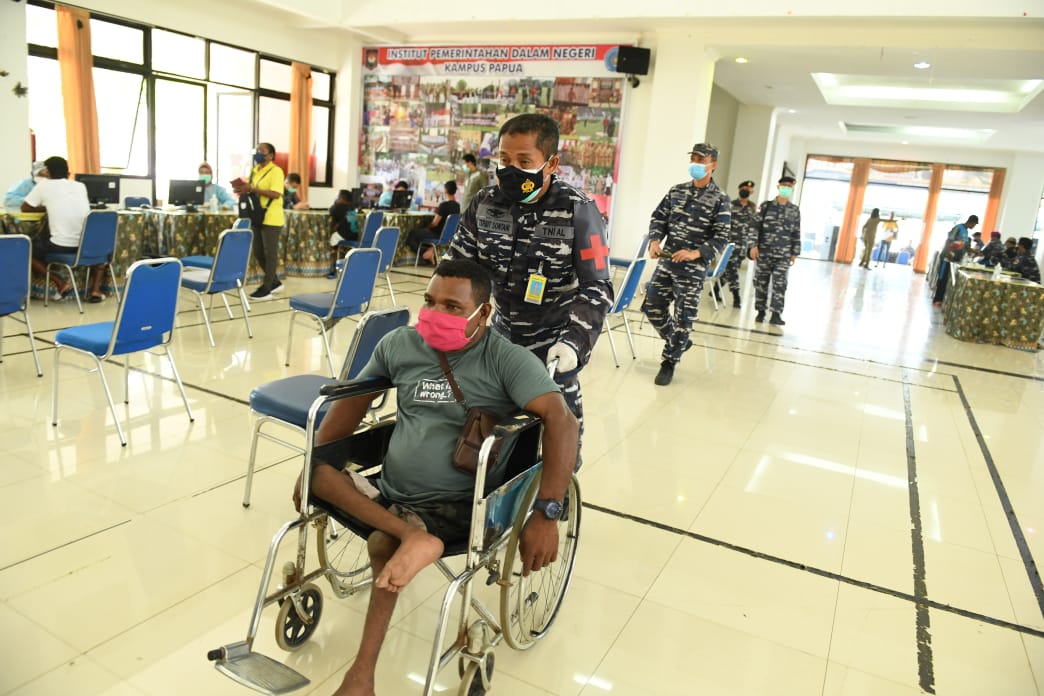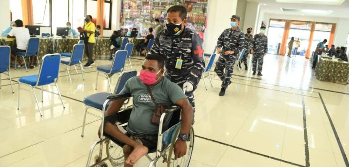 JAYAPURA, Teritorial.com – Satuan Tugas (Satgas) Papua TNI Angkatan Laut (TNI AL) melalui program “TNI AL Peduli Berbagi” melaksanakan serbuan vaksinasi kepada para Atlet Penyelenggara Pekan Paralimpik Nasional (Peparnas) ke-16 Papua Tahun 2021 serta masyarakat sekitar dalam rangka menyukseskan acara Peparnas ke-16 Papua bertempat di Aula Kampus Institut Pemerintahan Dalam Negeri (IPDN) Papua, Senin (13/9).