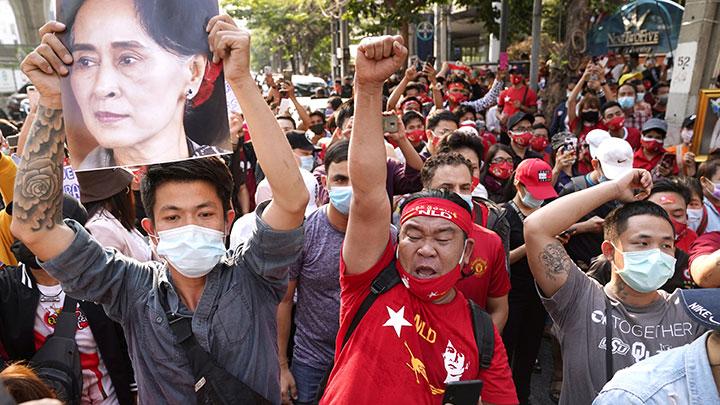 Banyak di antara kerumunan itu mengenakan pakaian merah, warna Liga Nasional untuk Demokrasi (NLD) Suu Kyi yang menang telak pada pemilihan 8 November, akibatnya para jenderal menolak mengakui klaim penipuan. Ketika protes membengkak dan para aktivis mengeluarkan seruan di media sosial agar orang-orang bergabung dalam pawai, internet negara itu lumpuh.