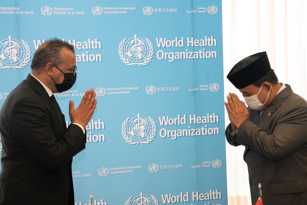 Swiss- Menteri Pertahanan RI Prabowo Subianto bertemu dengan Dirjen WHO Dr Tedros A Gebreyesus di Kantor Pusat WHO, Jenewa. Swiss (30/6/2021).