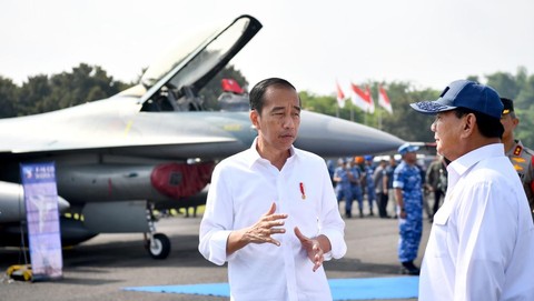 Jokowi dan rombongan terbatas melihat kesiapan tiga pesawat tempur TNI AU, yakni satu pesawat T-50 dan dua pesawat F-16.