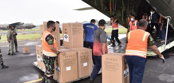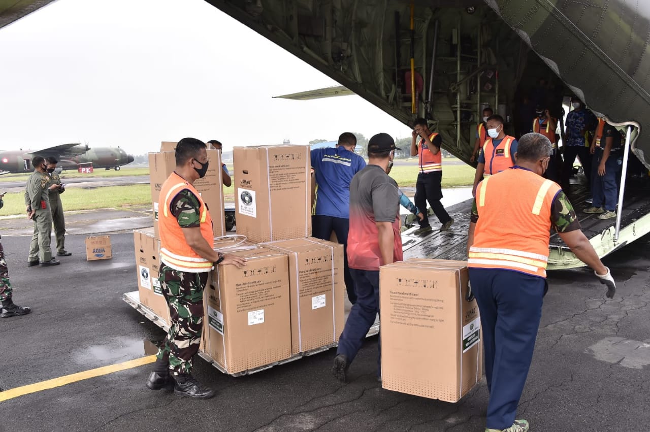 Pesawat jenis Hercules C-130 dengan Pilot Mayor Pnb Aleg Chandra dari Skadron 31 Lanud Halim Perdanakusuma mengangkut bantuan sebanyak 175 koli alat kesehatan, terdiri dari alat Oksigen Konsentrator dan Selang Nasal Cannula untuk dua wilayah di Sumatera, yaitu Padang dan Medan.