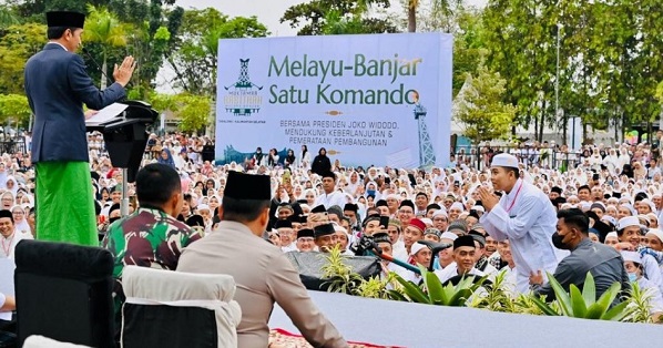 “Juga memohon rida Allah SWT agar selalu membimbing dan memudahkan langkah-langkah kita, dan kepada para alim ulama, tuan-tuan guru, dan para mualim, para kyai, serta segenap masyarakat Melayu-Banjar mohon didoakan bangsa ini,” ucap Presiden.