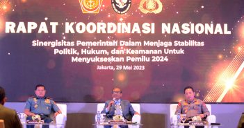 Foto 29 Mei 2023 Rapat Koordinasi Nasional Pemilu Nasional JAKARTA, Teritorial.com – Menko Polhukam Mahfud MD (tengah) didampingi Panglima TNI Laksamana TNI Yudo Margono…