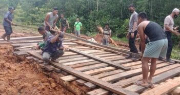 Jalan Terputus, Satgas Yonif 125/SMB Bersama Koramil, Polsek dan Warga Kerja Bakti Lakukan Perbaikan